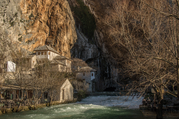En Blagaj, se encuentra el monasterio de los Derviches o monjes otomanos que habitan este lugar desde hace siglos construido en la montaña y junto al río Neretva que brota de la roca con furia. Este monasterio fue construido en 1520 con elementos tanto otomanos como mediterráneos. Cuando nos acercamos, hay no sé cuántos autobuses con un gentío abrumador, claro, es domingo.