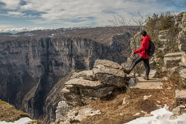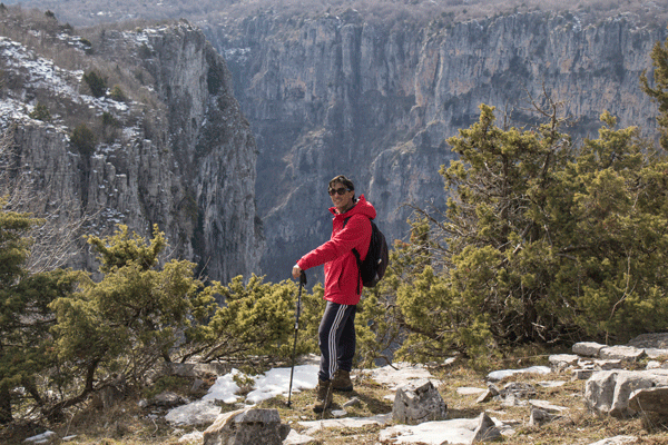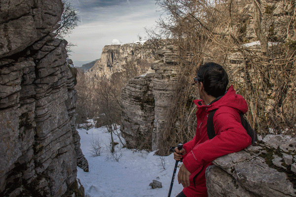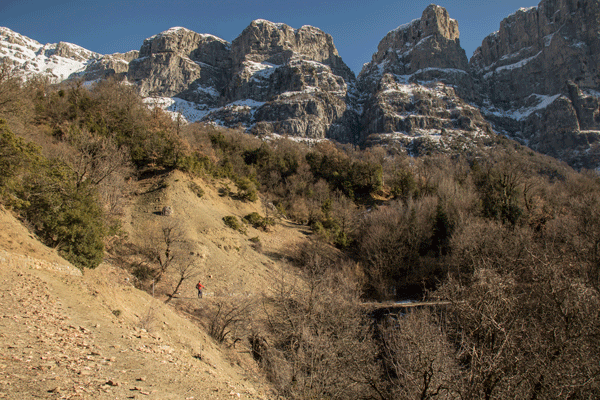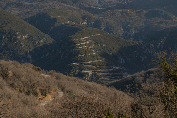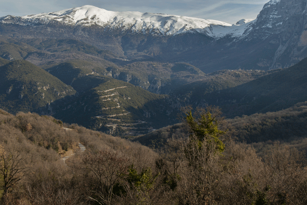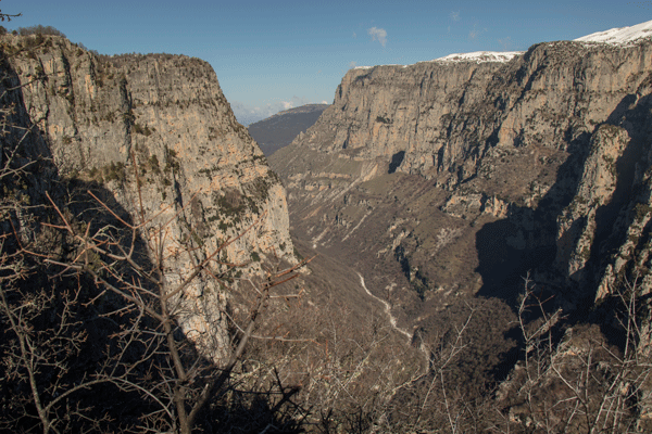 Después de los magníficos escenarios que vistamos ayer, nos hemos levantado con ganas de más y ponemos rumbo hacia Vradeto. Queremos meternos de lleno en el cañón de Vikos y para ello comenzamos una andada en este pueblo. Si subir a Mikro Papingo fue una prueba de fuego, esta carretera no se queda atrás, y además sin quitamiedos, eso sí, espectacular. En cada curva parece que vayamos a caer al vacío, pero un vacío increíblemente bello, donde conforme vamos ascendiendo, la nieve va cubriendo todo el paisaje que nuestros ojos llegan a alcanzar.