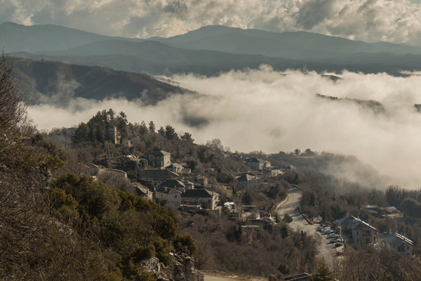 Estas curvas de casi 360º, nos conducen a un poblado de unas cuantas casas de piedra muy cucas habilitadas como hostales, y un par de restaurantes donde preguntamos la posibilidad de hacer una andada por estas magníficas montañas, que pertenecen al Parque Nacional de Vikos-Aoós ; nos advierten que hay nieve y está complicado, pues eso parece divertido, pensamos nosotros.