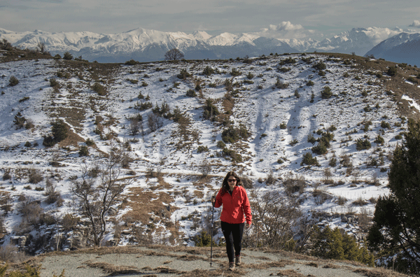 Atravesamos “el pueblo” que son un par de casas derruidas y un hostal con unas vistas espectaculares y seguimos camino monte arriba. En cuestión de minutos, la ruta se desvanece por la nieve y debemos imaginar por dónde ir. Está claro que imaginamos mal y damos  unas cuantas vueltas para llegar a nuestro destino, el mirador de Beloi.