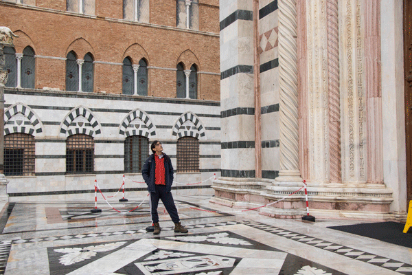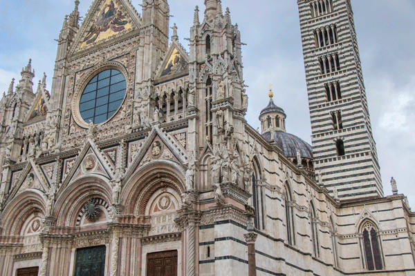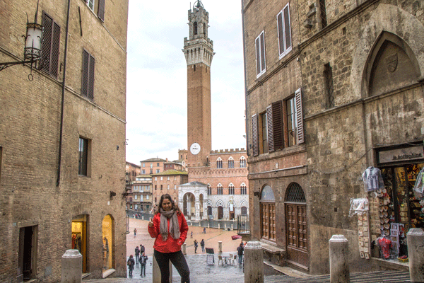 Aunque sigue lloviendo, hacemos un recorrido por las calles de Siena, hasta llegar a la Plaza del Campo, donde se encuentra el magnífico Palazzo Pubblico y la Torre del Mangia, una delgada y altísima construcción del siglo XIV. Siena tiene rincones preciosos, y aprovechamos uno de ellos para refugiarnos de la lluvia, el palacio de Chigi Saracini y tomar un tiramisú y algo calentito, y donde la camarera, una cubana majísima nos cuenta la historia de este lugar cuyo dueño es una amante de la música y donde encontramos un verdadero museo que nos deja boquiabiertos.