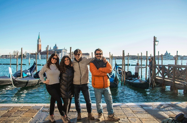 Y ahora otro encuentro, ya vamos en el tranvía, con la sonrisa de oreja a oreja y con el hormigueo en el estómago, y en el puente de Calatraba, con el magníficos escenario veneciano de fondo nos fundimos los cuatro en abrazos, euforia, lágrimas, y mucha mucha alegría.