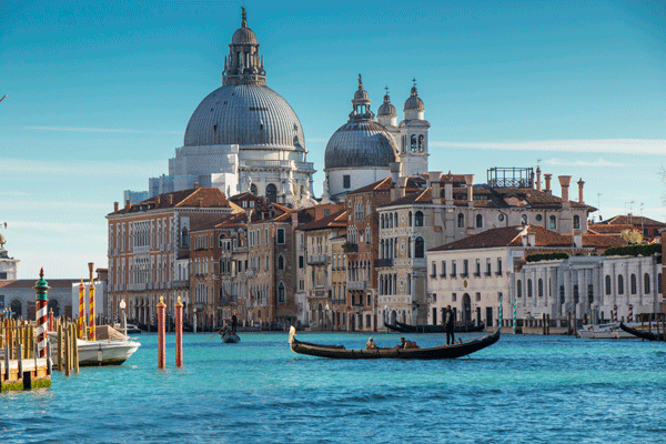 Venecia ha amanecido con un sol espectacular, acontecimiento que raramente sucede y la ciudad está radiante, con sus canales azul turquesa adornados por unos magníficos edificios, las góndolas paseando a las parejitas de enamorados, los gondoleros en las esquinas de los canales charlando entre ellos y con unos cuantos turistas mirando a todos lugares y empapándose de la maravillosa arquitectura que nos sabemos por cuantas generaciones permanecerá, antes de que las aguas del Adriático la engullan. Lo cierto es que la marea está por las nubes y la marea ha inundado la Plaza de San Marcos. Hay unos puestos de botas de plásticos, pero nos cobran doce euros por cada una, con lo que decidimos a través de unas pasarelas que hay montadas llegar hasta la basílica y hacer una visita con la esperanza de que baje la marea. Y si esta joya de construcción románico –bizantina nos ha fascinado por fuera, su interior cubierto de mármoles orientales, esculturas de bronce y sus fascinantes mosaicos de oro, nos han encantado.  Y bingo, a la salida, el Adriático, nos permite contemplar un maravilloso atardecer desde la plaza.