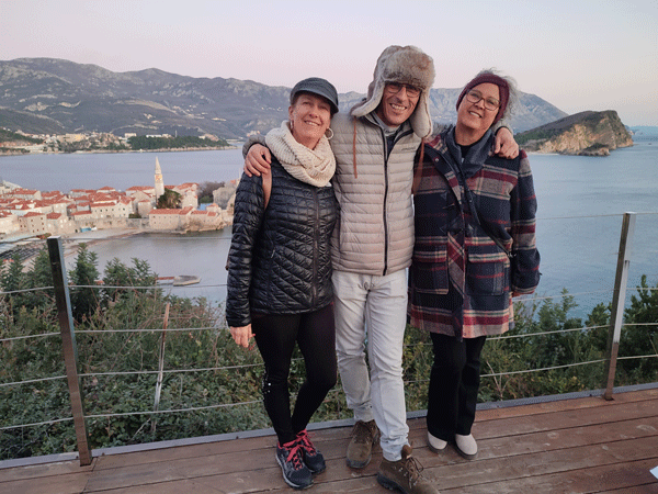 Evelyn, ha sido viajera toda su vida, de hecho conoció a su marido, americano de nacionalidad viajando de mochilera. Formó una familia, pero veintitantos años más tarde, ha tomado otro rumbo en la vida. Es una mujer aventurera, con coraje y muy sana, de hecho nos ha preparado para comer quinoa acompañada de verduras; nosotros llevamos jamón serrano, salchichón y patatas fritas, menudo contraste, pero bueno, en la variedad está el gusto. Mientras disfrutamos de un vino de nuestra tierra, nos contamos historias de viajeros, de formas de vida diferentes y de nuestras impresiones sobre el paso por Montenegro. Estando allí, nos contacta Elsa y decidimos hacer una quedada para tomar un café en un lugar espectacular con vistas al mar y a la ciudad vieja. Disfrutamos de la agradable compañía de estas dos mujeres tan diferentes, pero que tanto nos han aportado.