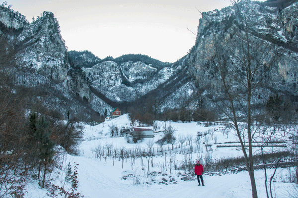 Después de recorrer el puente no sé cuántas veces para tomarle fotos desde todas las perspectivas, nos adentramos en la garganta del rio, un gigantesco pasillo de piedra de una altura colosal. En algunos de los tramos, parece que se va a desplomar encima de nosotros que somos diminutos en esta majestuosa ruta, aunque lo que sí puede que nos caída encima es alguna de las gigantescas estalactitas que se han formado en los túneles por los que vamos pasando. Recorremos unos veinte kilómetros por esta carretera para ir a visitar una iglesia ortodoxa del siglo XVII en un paraje de lo más bucólico. Está comenzando a anochecer, y cuando miramos la temperatura que marca el coche, nos da todo menos la risa, -9 ºC.