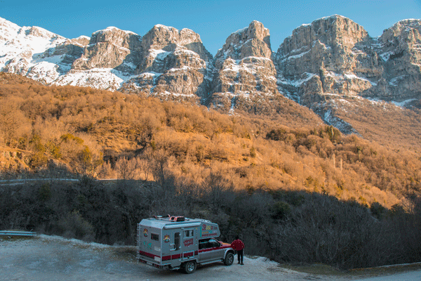 Después de los magníficos escenarios que vistamos ayer, nos hemos levantado con ganas de más y ponemos rumbo hacia Vradeto. Queremos meternos de lleno en el cañón de Vikos y para ello comenzamos una andada en este pueblo. Si subir a Mikro Papingo fue una prueba de fuego, esta carretera no se queda atrás, y además sin quitamiedos, eso sí, espectacular. En cada curva parece que vayamos a caer al vacío, pero un vacío increíblemente bello, donde conforme vamos ascendiendo, la nieve va cubriendo todo el paisaje que nuestros ojos llegan a alcanzar.