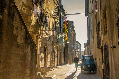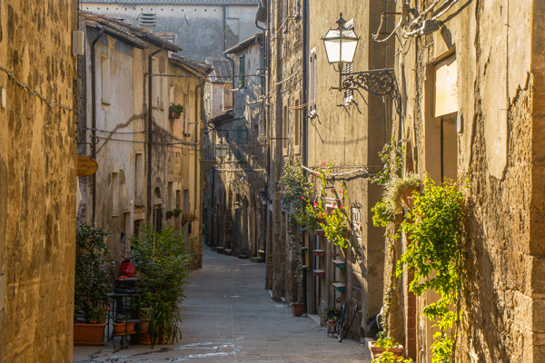 De Saturnia, nos acercamos a Pitigliano, una población que desde la carretera parece ser de cartón piedra y conocida como la pequeña Jerusalén, es de la época etrusca un pueblo contemporáneo de los romanos y antes los que cayeron derrotados. Sus casas y edificios están hechos de toba, la piedra de esta zona y que hace las construcciones del lugar muy características. Sus callejuelas vacías nos transportan a otra época, algunos callejones que dan al acantilado, dejan pasar ligeramente pequeños rayos de luz creando momentos mágicos a nuestro paso.