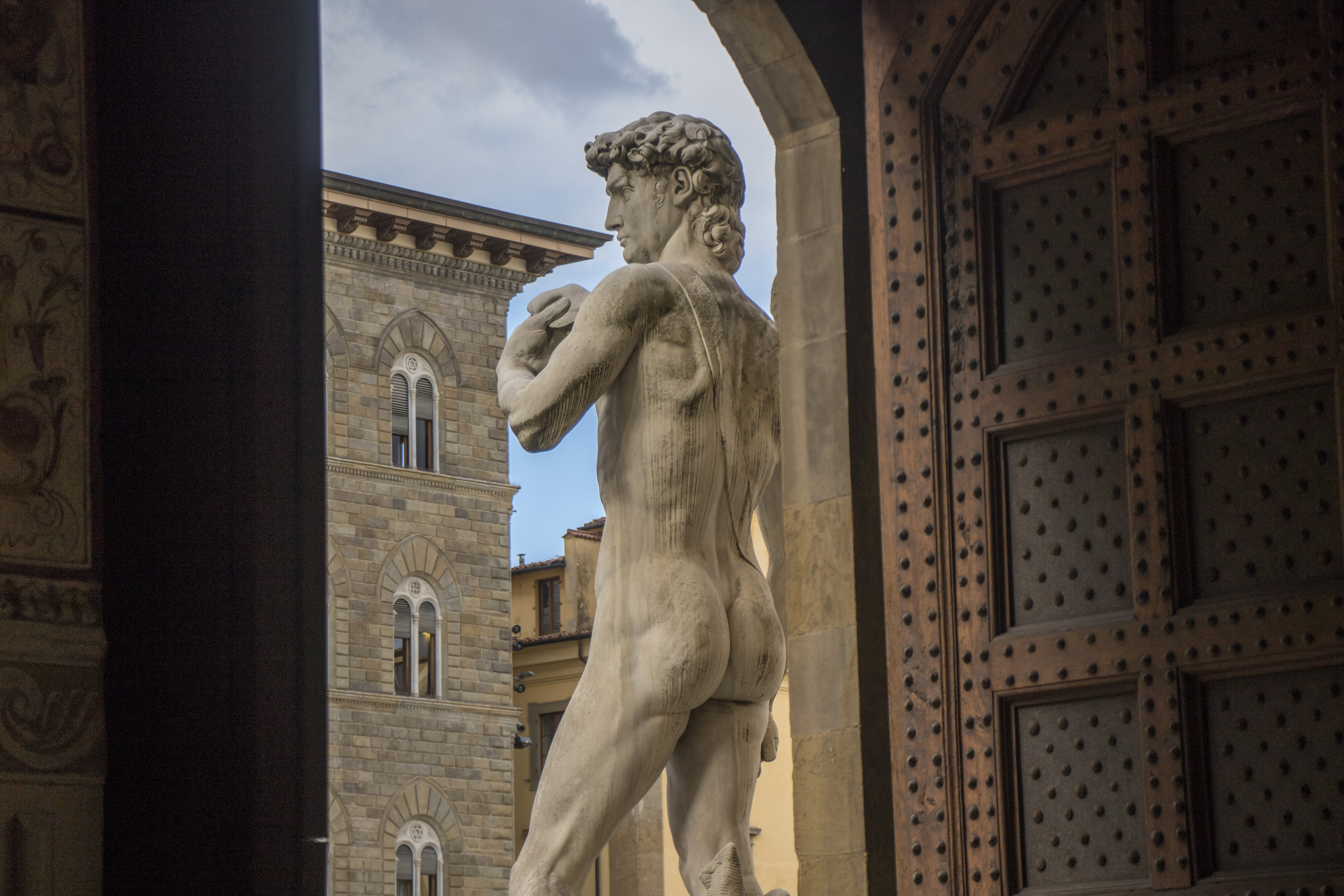 Desde que ponemos el pié en Florencia sentimos una sobredosis de arte viendo todo lo que nos rodea, sus edificios, esculturas, puentes, músicos en las calles… mi cámara de fotos está literalmente echando humo. Pero lo que nos deja verdaderamente maravillados es la visita a la Galería de la Academia, donde el imponente David de Miguel Angel, está expuesto. La habíamos visto en fotos, pero tener delante de nuestros ojos esta mole de piedra esculpida con tanta delicadeza y precisión, dando tanta fuerza, expresividad y belleza supera nuestras expectativas. Esta obra fue encargada por los responsables de la Opera del Duomo en 1501, diversos escultores intentaron trabajar esta gran masa de mármol, pero no lo consiguieron, y fue Miguel Ángel quien se enfrentó a este reto culminándolo con la grandeza que todos podemos ver y que en su día fue la sensación de la época.