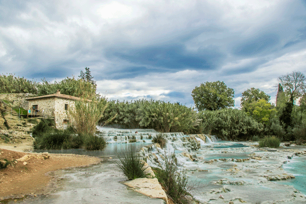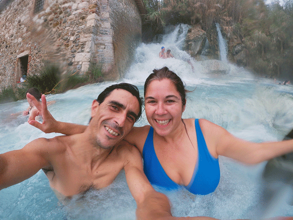 Hemos amanecido temprano y con unas ganas tremendas de llegar a nuestro próximo destino: Las termas de Saturnia. Llegamos al medio día después de un trayecto por carreteras secundarias y en un estado bastante penoso, y aunque con el culo y la espalda de tanto bache un poco resentidos, el paisaje es extraordinario, idílico, con viñedos a un lado de la carretera y olivos al otro y con una neblina que nos envuelve junto con el paisaje.