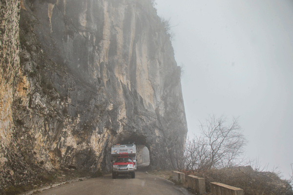 Nuestro siguiente destino es Ostrog, un monasterio construido en un lugar recóndito y excavado en la roca. El temporal continúa y además con un vendaval tremendo, cuando vemos el desvío hacia el monasterio, nos pensamos el ir o no ir, porque la ruta es muy estrecha, llena de curvas y los quitamiedos son pedruscos por entre los que cabe la Española. Teniendo en cuenta que la visibilidad debido a la niebla y la nieve, parece que no tiene mucho sentido, pero aun así comenzamos a ascender por esta carrera que va tensando mi cuello poco a poco, hasta que un par de coches que vienen de frente en una de la curvas sin visibilidad me hacen botar en el asiento.