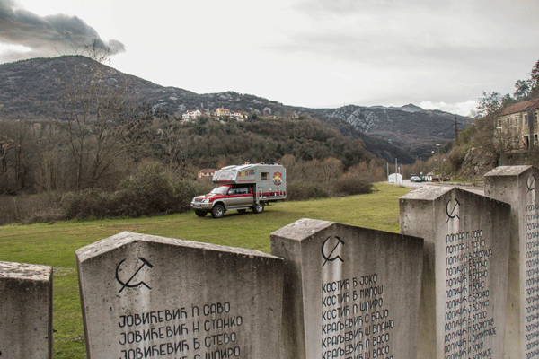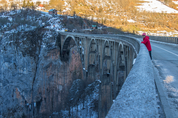 Conforme avanzamos, las montañas forman un magnífico cañón y abajo, el río Tara, con un color esmeralda que no parece real y la atracción del lugar, su puente de 172 metros de altura. Una obra arquitectónica llevada a cabo entre 1937 y 1940 y que en su día fue el puente de hormigón más grande de Europa. No sé qué da más vértigo, si cruzarlo andando o con La Española. La sensación de que esta mole llena de grietas y en estado bastante decadente, enclavada en la roca se puede desplomar en cualquier momento, es inevitable.